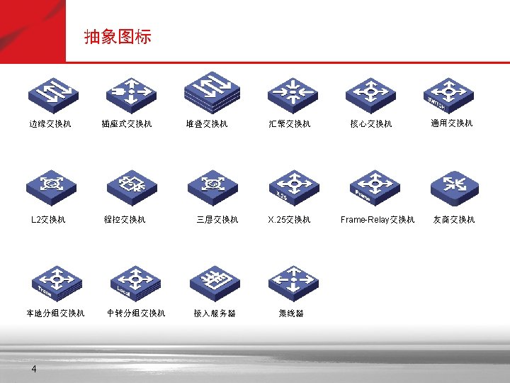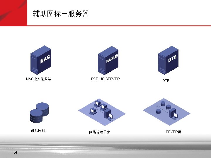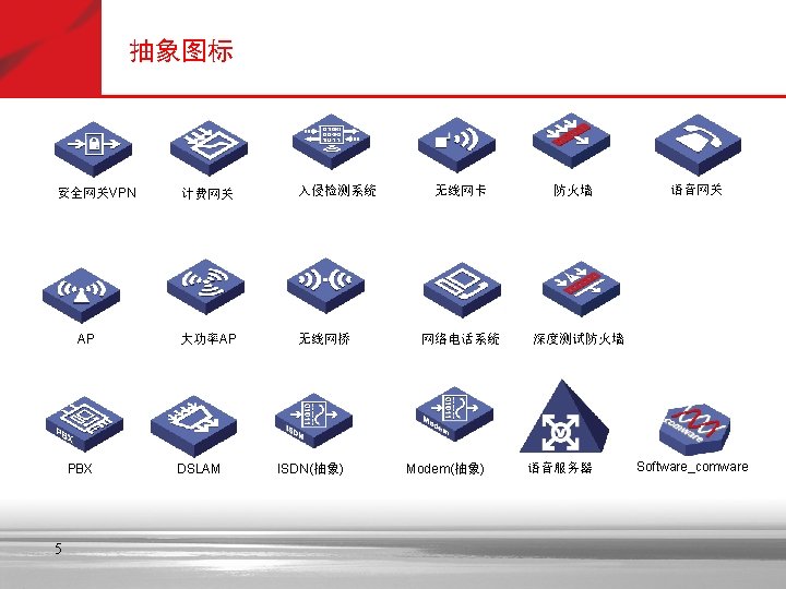 抽象图标—浅紫 Soft X(CS) SGW 信令网关 Portal 拓扑管理 GK AAA 策略管理 服务器 MSTP Lan Switch VOATM GW NAS SIPP CMTS 路由器 AMG 5000 Cach(缓存) SIP Server Bridge C&C 08 MRS 6000 PBX Metro ATM 交换机 SMⅠ SMⅡ i. OLT 信令管理 APP Server OLT MD FA MA 5200 ONU AGW Radium 8750 TMG 8000系列 MA 5100 VOIP GW VOIP功能 MSR多业务 路由器 交换机 (ATM/IP/MPLS) IAD