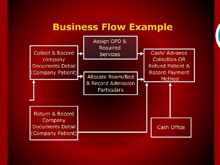 Business process model • A patient may come to visit In Patient Department (IPD) or output patient department (OPD) • System determines if he is a company patient or a private patient. • For a company patient, system verifies him. • For an OPD patient, system will issue a chit to the patient and inform him about his number and the consultant to whom he has to consult and he will have to wait for his turn. • After verifying an IPD patient, system will create a visit and allocate him a room or a bed etc. If system cannot allocate this, then it will inform the patient. • Otherwise the patient is checked in and his information is maintained in the system. • System displays information about the expenses of the required