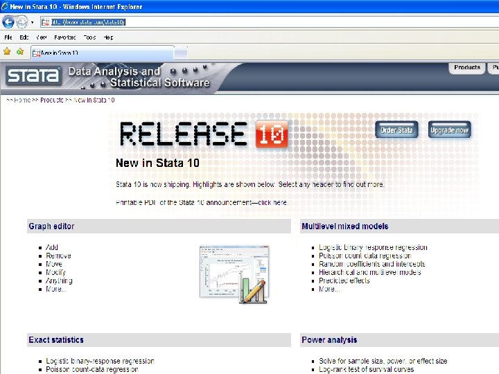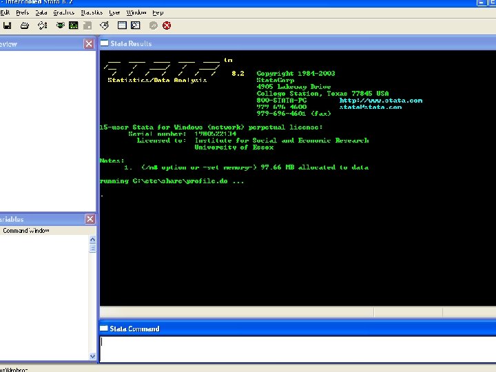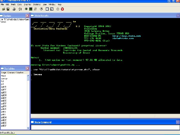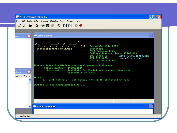 Advantages and disadvantages of Stata l l l User driven Free STBs Dedicated journal Web active Memory requirements Backward compatible Change! l SPSS dominance l Orientated to writing syntax/code l Pull-down windows debate! Now in version 8 forward l