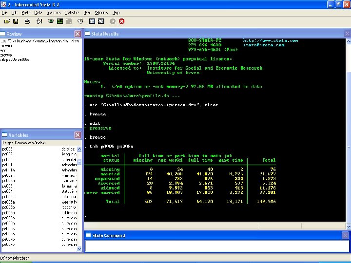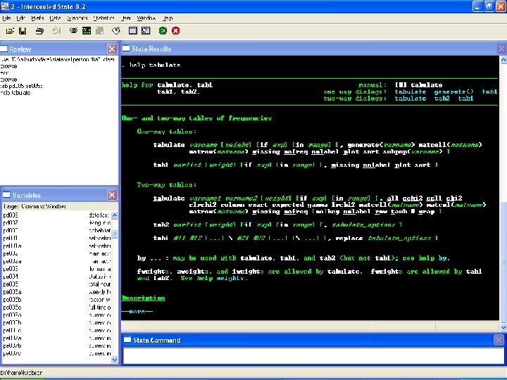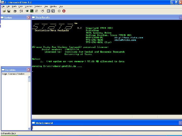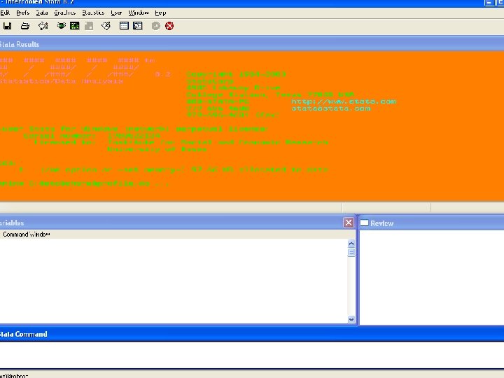 Variable window INPUT Stata command window Review window Do file Pull-down menu Computation RESULTS Output window Log file