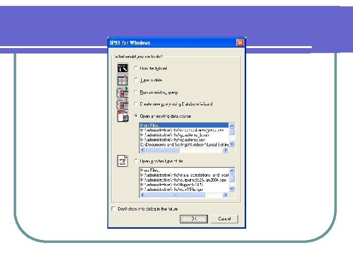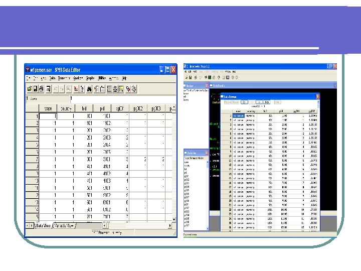 Comparing with SPSS l Start up differences l With data file open l Viewing data l data viewer, data editor