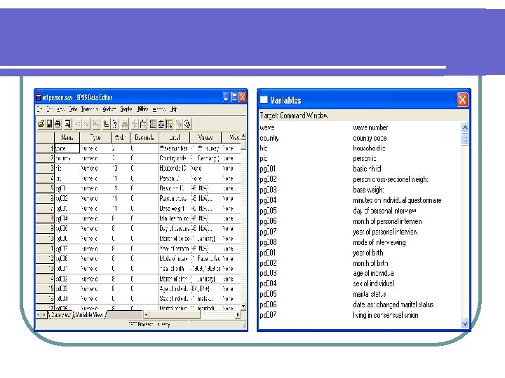 Comparing with SPSS l Start up differences l With data file open l Viewing data l data viewer, data editor l Viewing variables l Viewing output/commands l output window buffer, log files