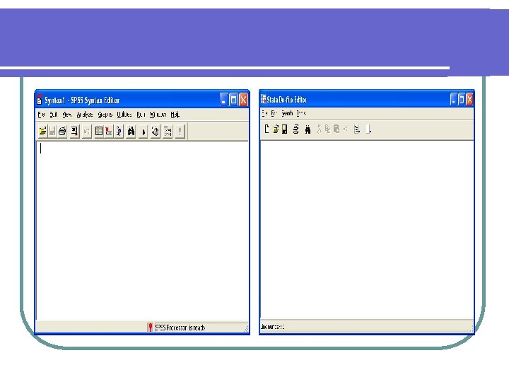 Comparing with SPSS l Start up differences l With data file open l Viewing data l data viewer, data editor l Viewing variables l Viewing output/commands l output window buffer, log files l Syntax and “do files”
