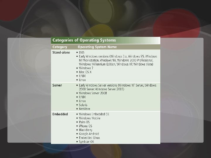 Operating Systems An operating system (OS) is a set of programs containing instructions that work together to coordinate all the activities among computer hardware resources Start and shut Manage Provide a down a computer user interface programs memory Coordinate tasks Configure devices Establish an Internet connection Monitor performance Provide utilities Automatically update Control a network Administer security