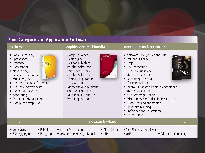 Application Software Application software consists of programs designed to make users more productive and/or assist with personal tasks To make business activities more efficient To assist with graphics and multimedia projects To support home, personal, and educational tasks To facilitate communications