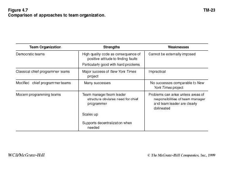 Democratic Team • Group works for a common cause with no single leader; each member finds faults in others’ code • advantages – positive attitude towards finding faults – especially productive in solving hard problems • disadvantages – management has difficulty working with egoless team – senior members may resent review by beginners