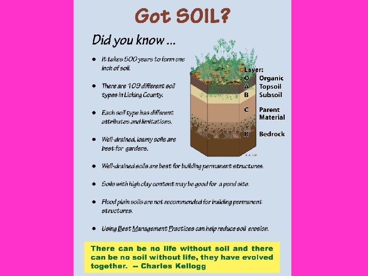 3 Main Horizons • A Horizon – called topsoil Consists mostly of organic matter, lots of insects, fungi and microorganisms – where most decomposition takes place • B Horizon – called subsoil Consists of clay particles washed out of A horizon • C Horizon – Consists of weathered parent material (rock)