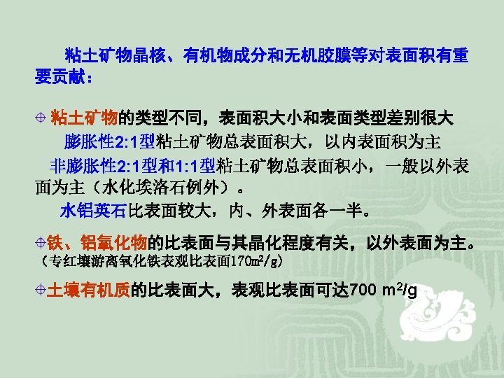 第一节 土壤胶体的表面性质 Surface properties of soil colloid l Concepts of soil colloid The colloid is a state of matter consisting of very fine particles that approach but never reach molecular sizes. (0. 2μm~5 nm) Soils contain large amounts of soil material in a colloidal state. l Clay comprises all inorganic solids smaller than 0. 002 mm (2μm) in effective diameter and is considered a colloid. l Soil organic matter and plant solids also occur in the colloidal state.