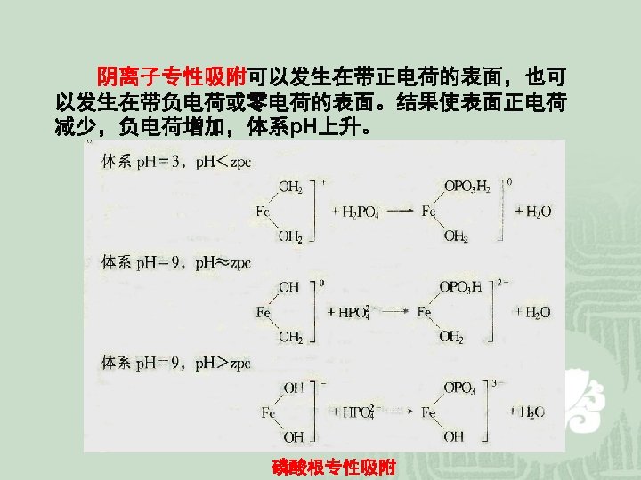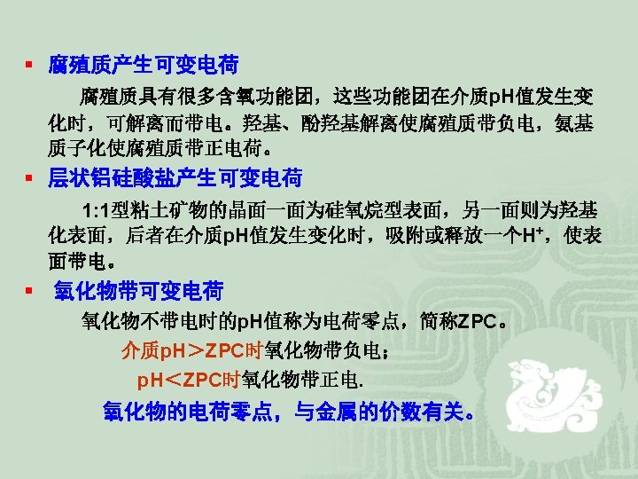 è可变电荷 Variable or p. H-dependent charge 来源: 土壤固相表面从介质中吸附离子或向介质中释 放离子。 Dissociation of exposed hydroxyl groups. Alkaline medium: -M-OH + OHAcid medium: -M-OH + H+ -M-O- + H 2 O -M-OH 2+ 特点:电荷类型和电荷数量均决定于介质酸碱度,又 称p. H依变电荷。
