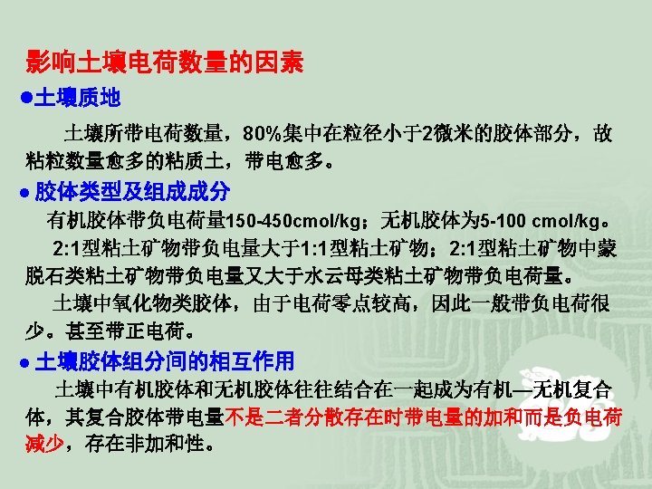 l 土壤电荷种类和来源 Type and origin of charge in soils è永久电荷 Permanent charge 来源: 粘土矿物晶层中核心离子的同晶替代 特点:不受介质p. H值和电解质浓度的影响 Isomorphous substitution is believed to be a major source of negative charges in 2: 1 layer clays.