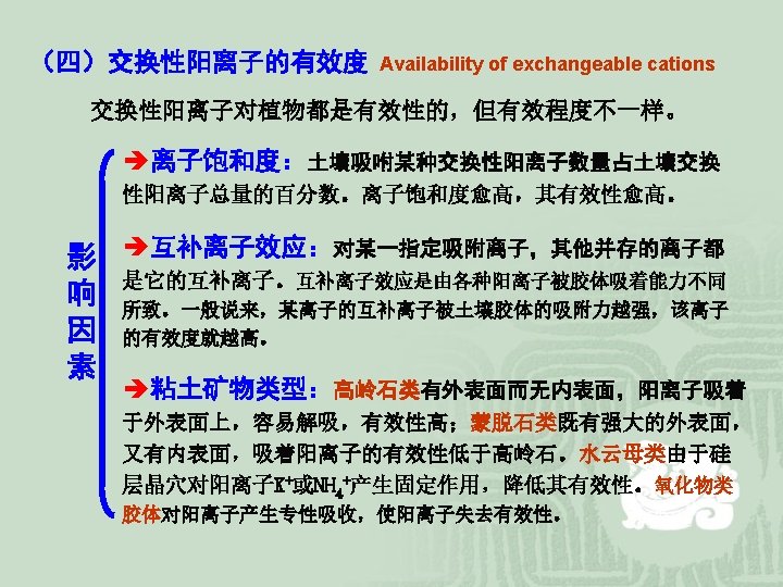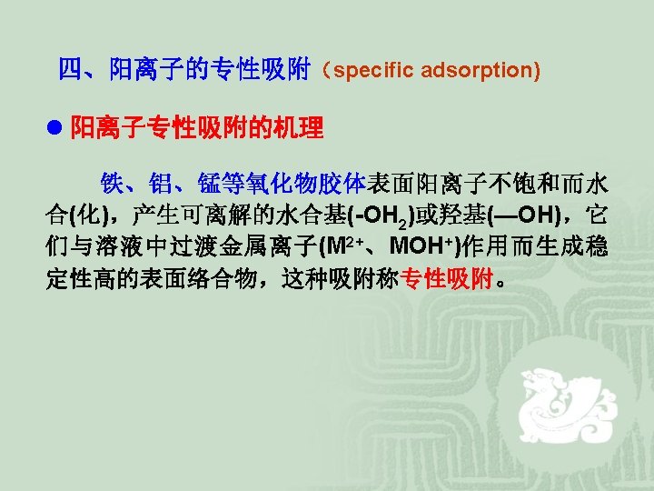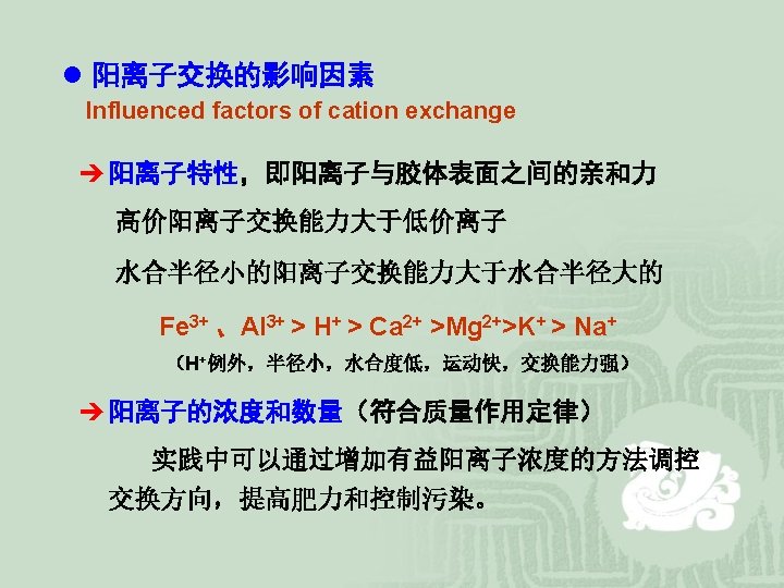二、阳离子静电吸附 Cation adsorption by electrostatic bonding Electrostatic bonding is the reason for cation adsorption and exchange reactions on clay surface. Since clay colloids carry negative charges, cations are attracted to the clay particles. They are held electrostatically on the surface of the clay. Most of them are free to distribute themselves through the liquid phase by diffusion. The density of ion population is greatest at or near the surface. These cations are called adsorbed cations. 阳离子吸附:土壤溶液中的阳离子转移到土壤胶体表面,为 土壤胶体所吸附。 阳离子解吸:土壤胶体表面吸附阳离子转移到土壤溶液中。