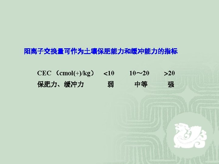 (二)阳离子交换量 (CEC) Cation exchange capacity CEC of soils is defined as the capacity of soils to adsorb and exchange cations. The unite is cmol(+)/kg. (International System) CEC是土壤所能吸附和交换的阳离子的容量 cmol(+)/kg It is common practice in the deternination of CEC to analyze all exchangeable cations. CEC=∑cmol(+) exchangeable cations per kg soil 土壤CEC实际上是土壤所带负电荷的数量。CEC与土壤胶 体的比表面和表面电荷有关。 CEC = specific surface areas × surface charge density