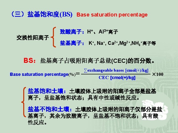 BS~p. H A positive correlation exists between base saturation percent and soil p. H. Low BS means the presence of a lot of H+ ions. Arid region soils are usually higher in BS than soils in humid regions. BS~fertility BS≥ 80% BS 50~ 80% BS< 50% 肥沃土壤 中等肥力土壤 低肥力土壤 BS of soils in China 我国土壤BS大致以北纬 33 为界。以北BS较高,一般达 80%~ 100%;以南BS均较低,只有20%~ 30%,甚至少于10%。 BS高的土壤,交换性阳离子以Ca 2+为主,其次是Mg 2+,分别 占 80%和15%。BS低的土壤,交换性阳离子以H+和Al 3+为主 。