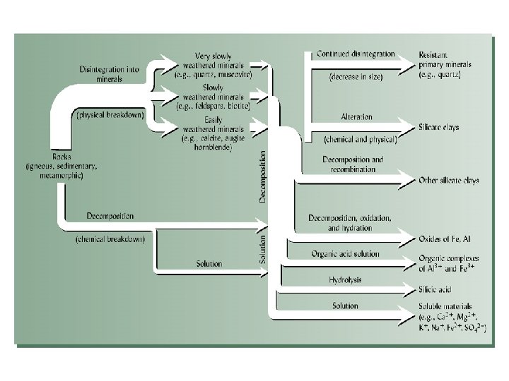 • Chemical (Biogeochemical) acts on surfaces: primary minerals are broken down and secondary minerals are formed.