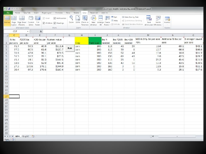 Example: Yield Goal of 200 bushel corn Soil 1 Soil 2 Nitrate nitrogen 20 lbs N recommendation 180 lbs N recommendation 100 lbs Soil health score 26. 0 Soil health Score 8. 0