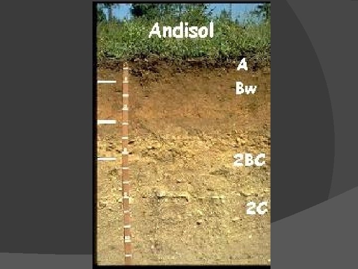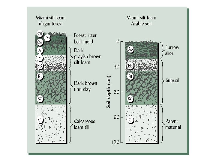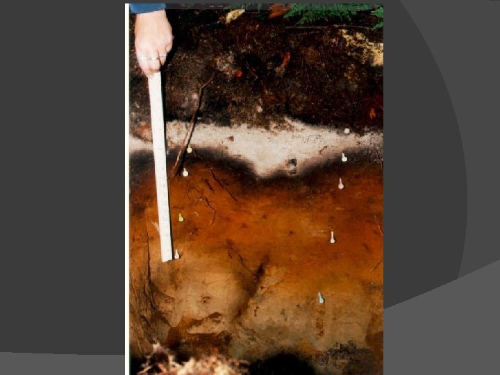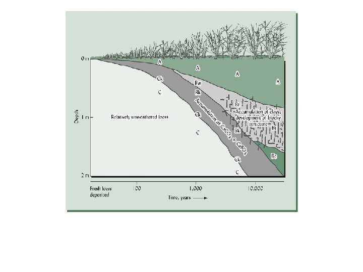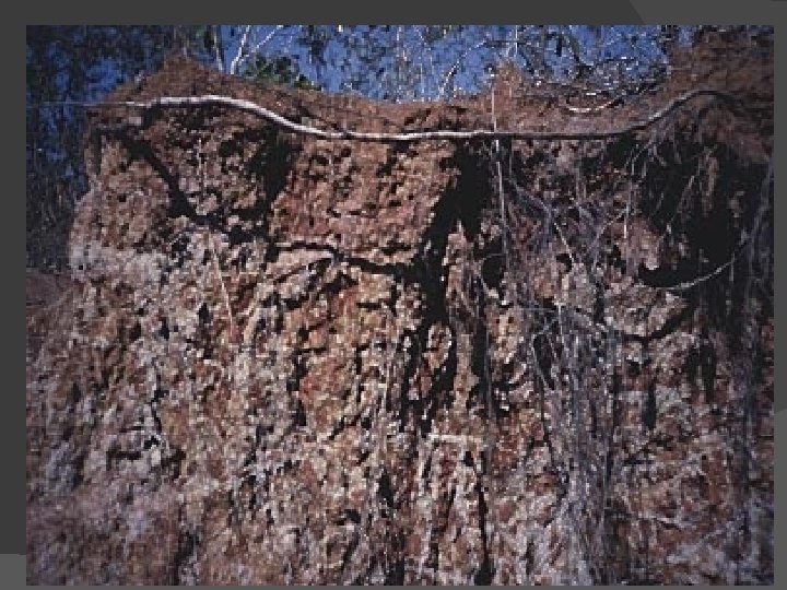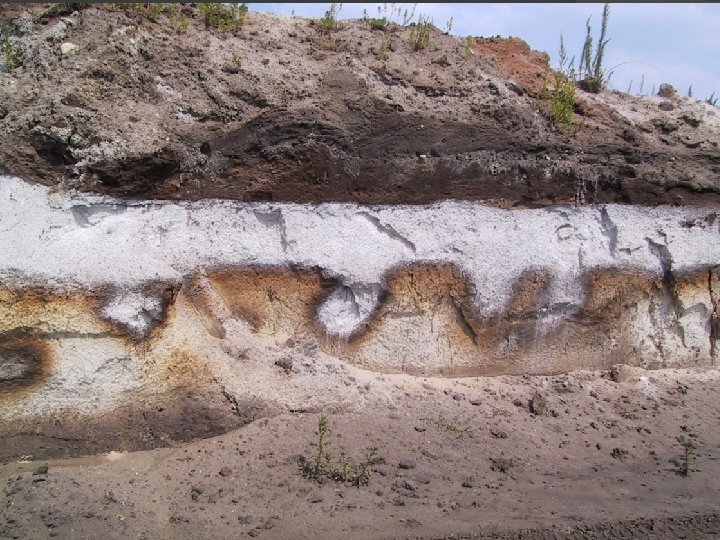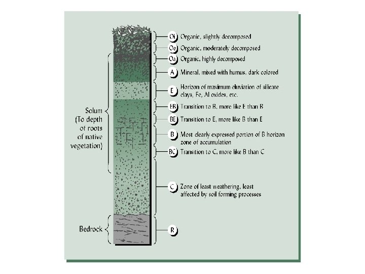 B horizon § ACCUMULATED (illuviated ) silicate clay, Fe & Al oxides, carbonates, gypsum, humus § distinguished from A : § stronger, redder, or darker color § OR different texture