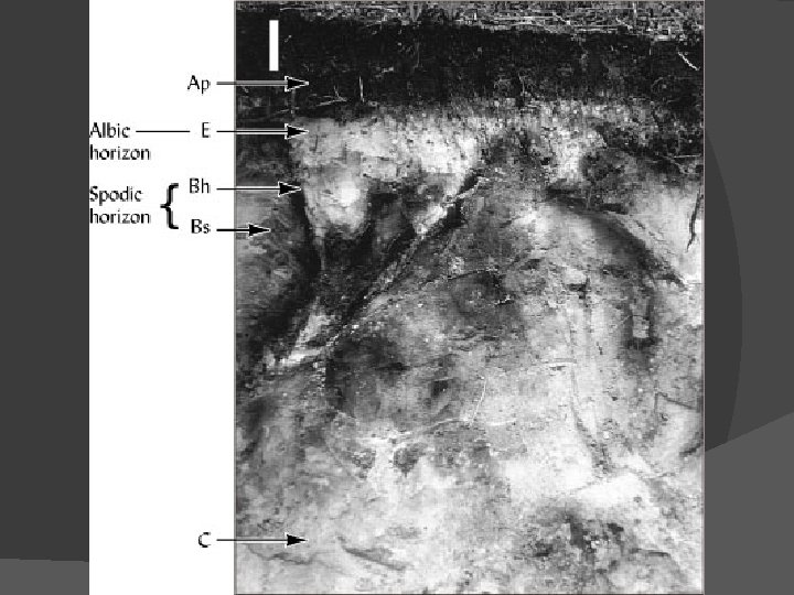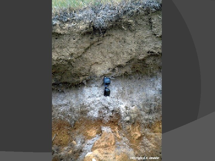 E horizon § LOSS of § silicate clay, Fe & Al oxides, humus by eluviation § carbonates, gypsum by leaching § lighter color than A § coarser texture than B due to clay loss