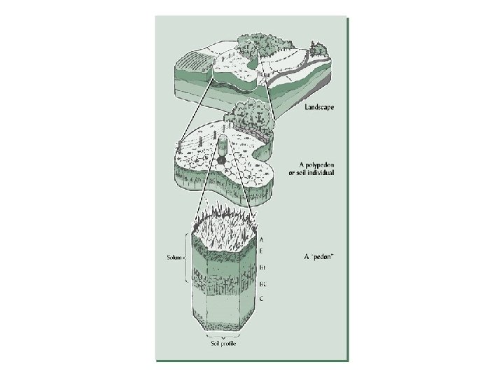 3 basic soil units (scale) Pedon: smallest volume called a soil Polypedon: soil body (2 or more pedons) in which soils are relatively uniform Soil Series: groups of like polypedons