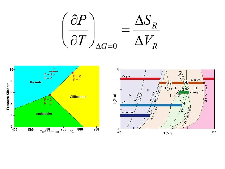 Phase Relations • Rule: At equilibrium, reactants and products have the same Gibbs Energy – For 2+ things at equilibrium, can investigate the P-T relationships different minerals change with T-P differently… • For DGR = DSRd. T + DVRd. P, at equilibrium, DG=0, rearranging: Clausius-Clapeyron equation