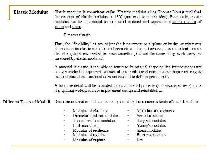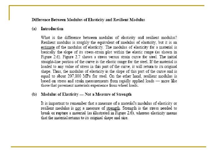 Strength & Stiffness of Subgrade Soil Subgrade materials are typically characterized by their resistance to deformation under load, which can be either a measure of their strength (the stress needed to break or rupture a material) or stiffness (the relationship between stress and strain in the elastic range or how well a material is able to return to its original shape and size after being stressed). In general, the more resistant to deformation a subgrade is, the more load it can support before reaching a critical deformation value. Three basic subgrade stiffness/strength characterizations are commonly used: California Bearing Ratio (CBR), Resistance Value (R-value) and Elastic (Resilient) Modulus. Although there are other factors involved when evaluating subgrade materials (such as swell in the case of certain clays), stiffness is the most common characterization and thus CBR, R-value and Resilient Modulus are discussed here.