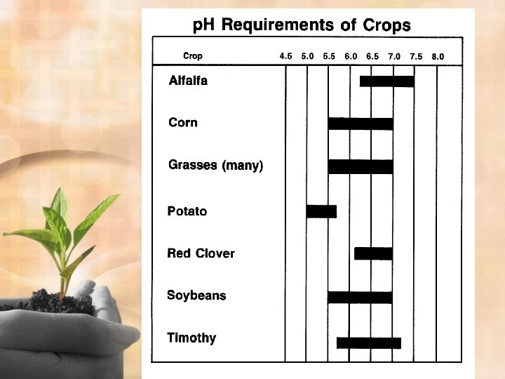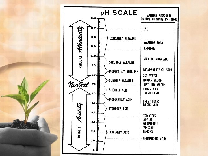 p. H • p. H ranges on a scale from 1 to 14 – 1 to 7 --Acidic soil – 7 --Neutral soil – 7 to 14 --Alkaline soil