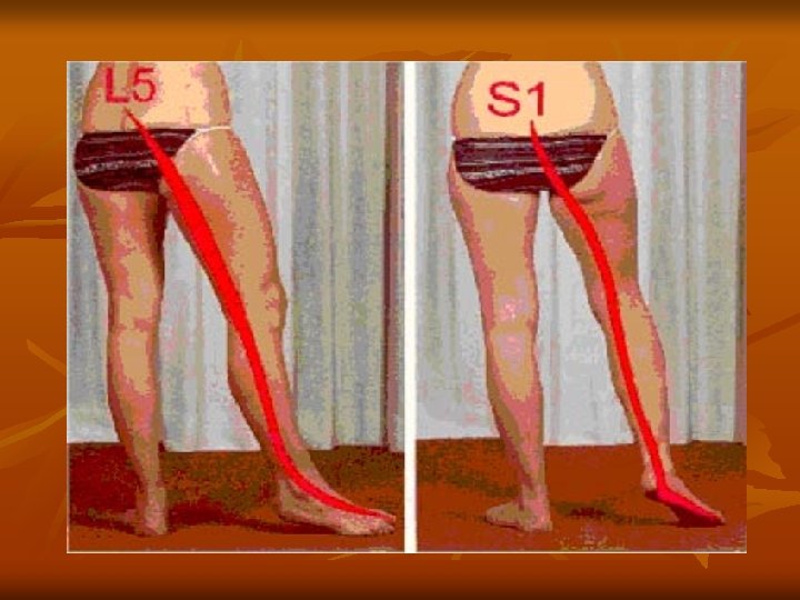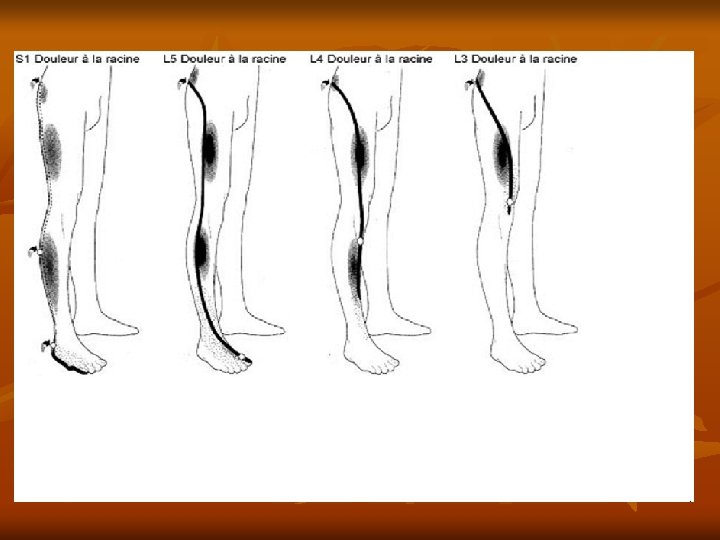 Causes C’est une compression des racines nerveuses L 5 ou S 1 due à une hernie discale (extrusion du disque intervertébral dans le canal médullaire), se manifestant par : • La lombalgie • La radiculalgie (douleur liée à la compression de la racine) la sciatique : L 5 face externe de la jambe S 1 face postérieure de la jambe la cruralgie : L 3 -L 4 partie antérieure de la cuisse