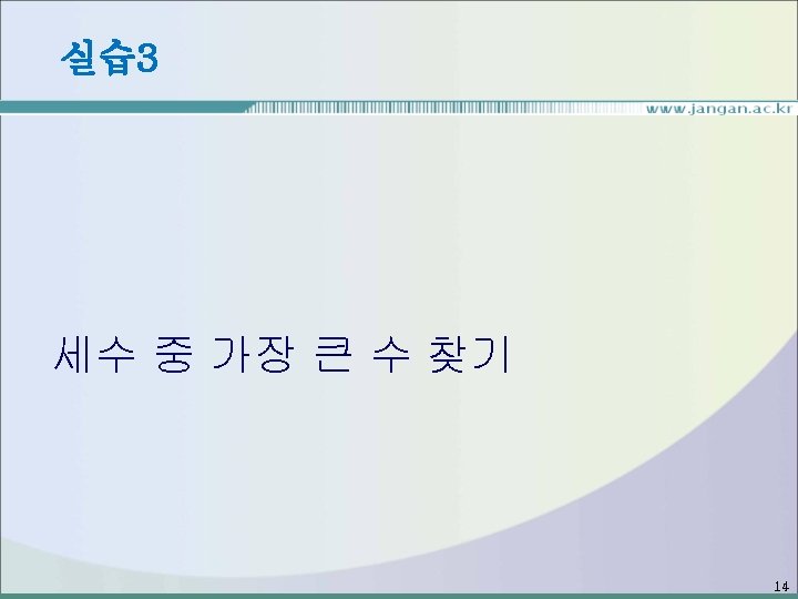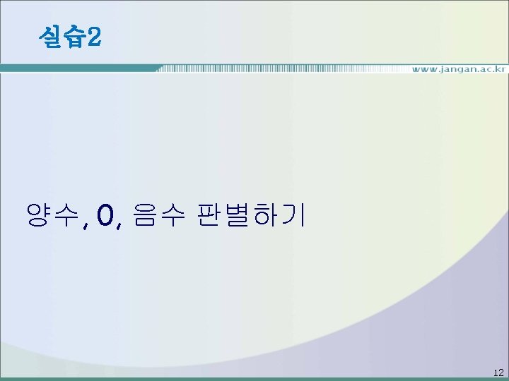 sol #include <iostream> using namespace std; int main() { int a, b; cout<<“정수(2개): ”; cin>>a>>b; if(a<0) { cout<<“음수다: ”<<endl; }else if(a>0){ cout<<“양수다: ”<<endl; }else{ cout<<“ 0이다: ”<<endl; } return 0; } 13