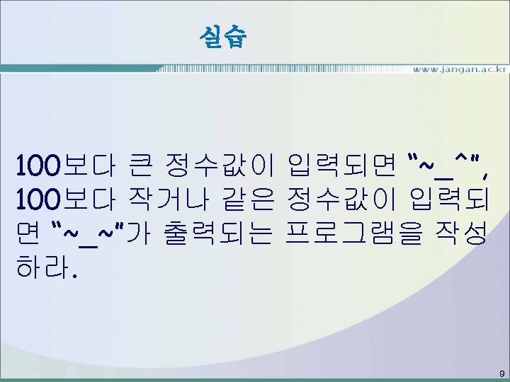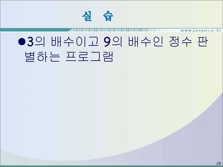 sol # include <iostream> using namespace std; int main() { int a; cout<<“정수 입력하세요: ”; cin>>a; if(a%3==0&&a%9==0){ cout<<a<<“는 3의 배수이면서 9의 배수입니다. ”<<endl; } else{ cout<<a<<“는 3의 배수이면서 9의 배수가 아닙니다. ”<<endl; } return 0; } 20