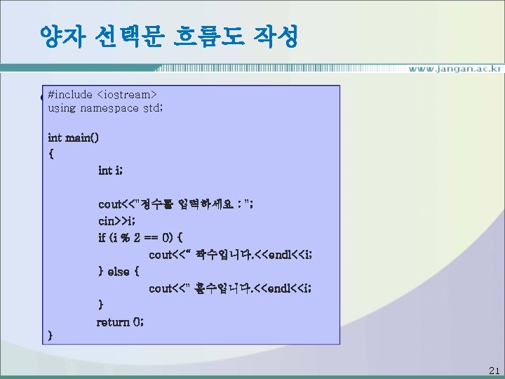 sol #include <iostream> using namespace std; int main() { int a; cout<<“정수: ”; cin>>a; if(a%2==0) { cout<<“짝수: ”<<endl; }else{ cout<<“홀수: ”<<endl; } return 0; } 17