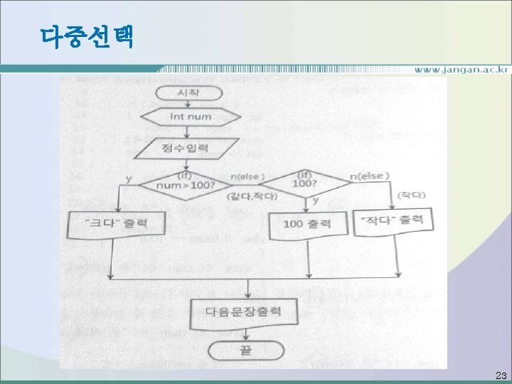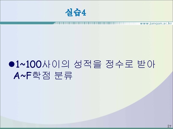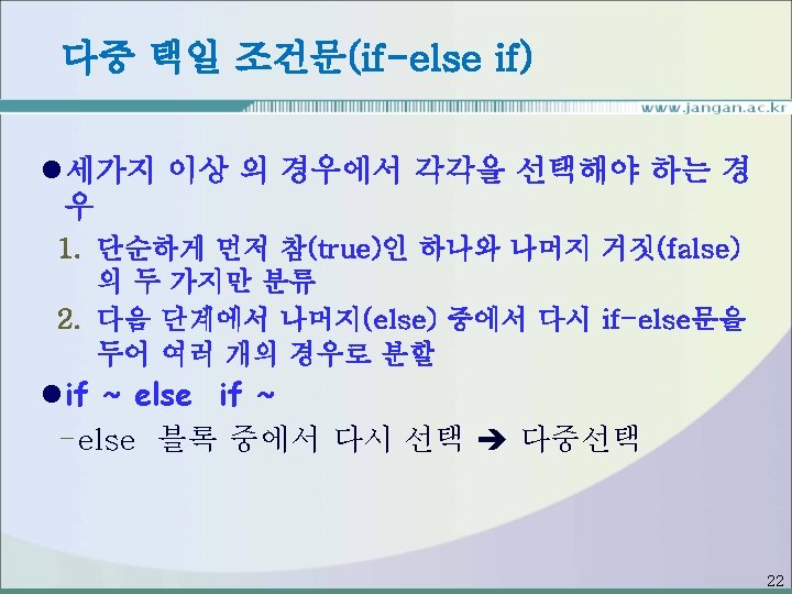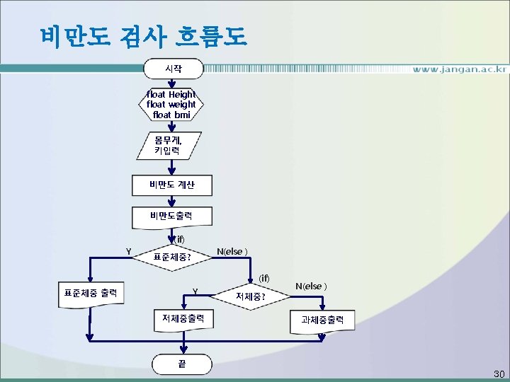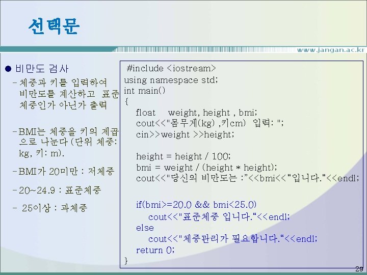 선택문 l if ~ else if ~ - else 블록 중에서 다시 선택 다중선택 #include <stdio. h> int main() { float weight, height , bmi; cout<<"몸무게(kg) , 키cm) 입력: "; cin>>weight >>height; if(bmi>=20. 0 && bmi<25. 0) cout<<“표준체중입니다. ₩n”; else if ( bmi<20 ) cout<<“저체중입니다. ₩n”; else cout<<“과체중입니다. ₩n”; height = height / 100; bmi = weight / (height * height); cout<<"당신의 비만도는 : ”<<bmi<<“입니다. ₩n"; if(bmi>=20. 0 && bmi<25. 0) cout<<"표준체중 입니다. ₩n"; else cout<<"체중관리가 필요합니다. ₩n"; return 0; } 28