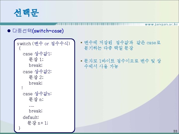 선택문 연습(윤년) l 4자리 년도를 입력하여 윤년인지 판단 코딩 § #include <iostream> using namespace std; int main() { int year, r 4, r 100, r 400; cout<<“년도 4자리 입력: "; cin>>year; r 4 = year%4; r 100 = year%100; r 400 = year%400; if( (r 4==0&&r 100!=0) || r 400==0 ) cout<<year<<“ 년은 윤년입니다. ”<<endl; else cout<<year<<“ 년은 평년입니다. ”<<endl; return 0; } 32