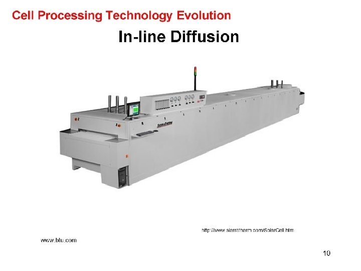 why In-line Diffusion? Formation of the pn-junction by phosphorus diffusion is one critical part of the manufacturing process for crystalline silicon solar cells, which affects performance and cost of the product. So far diffusion in tube furnaces with POCl 3 is the dominant principle. The process is well understood and has proven performance on industrial scale. However, because it is a batch process, POCl 3 diffusion requires complex handling with the risk of wafer breakage and cost of ownership is high. Therefore, there is a demand for alternatives and inline diffusion attracts attention.