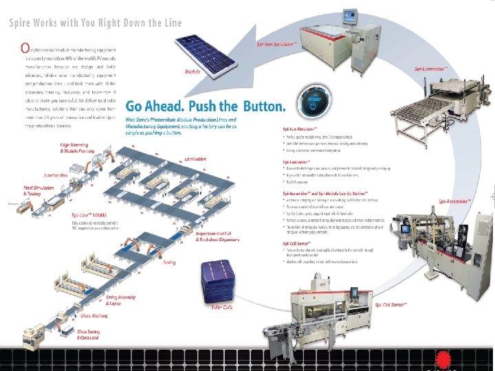 Solar module manufacturing process • Step 1 : Test & Sort Solar Cells Test and sort solar cells for optimized module performance. Cells of many types and shapes can be used in Spire manufacturing equipment.