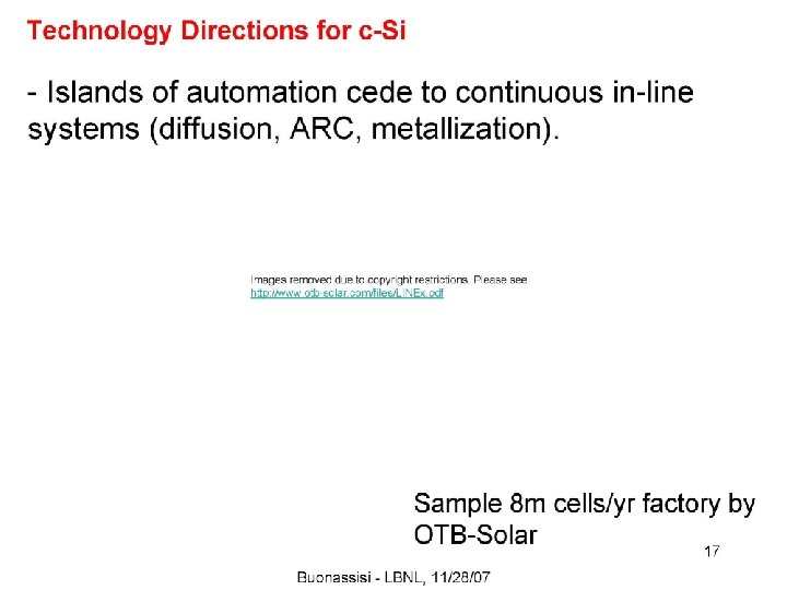 Polysilicon to Ingots Crucible Furnace 1500ºC Crystalization into a solid state Cooling from the base up Rising of the few remaining impurities to the top Multicrystalline ingot of extremely pure silicon