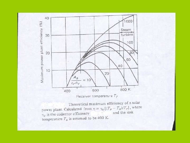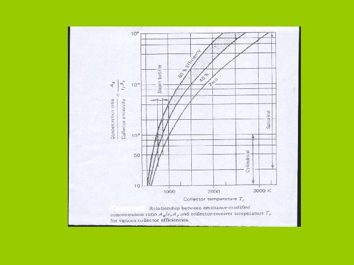 EXAMPLE: Desert at 32 North, Jordan, average q=800 W/m^2, Ta=305, Two collectors 1 st. Flat plate, (CR=1), Ur=5 W/K. m 2, (τα)=0. 8 2 nd. CPC, CR=3, Ur = 2 W/K. m^2. ρ = 0. 9, (τα)=0. 8. Calculate max. conditions. Solution: Using equations in last slide: 1 - Flat plate, Tr= 363. 5 K, ζth = 16. 1%, ζs=43% and ζov=7% 2 - CPC, (CR=3) Tr= 597 K, ζth= 49%, ζs=45% and ζov=22%