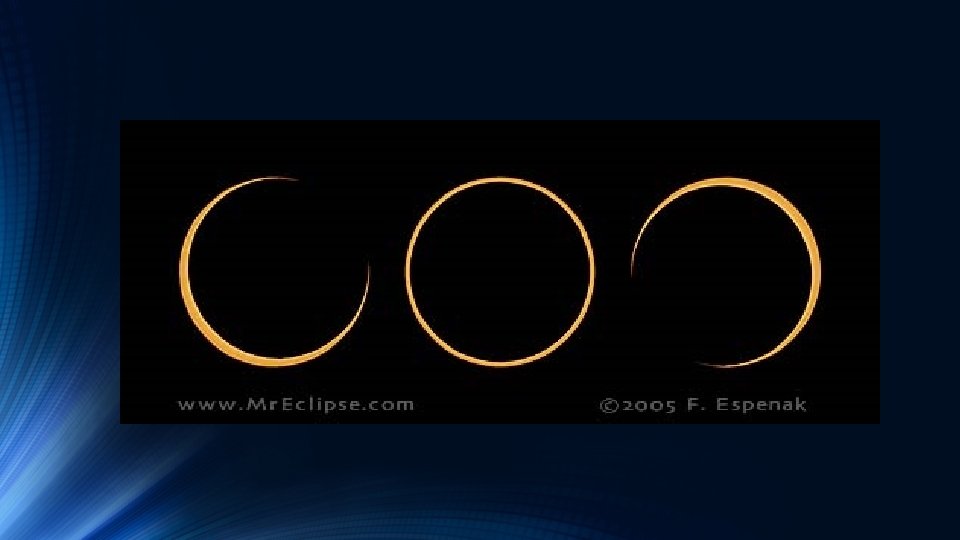 Annular Solar Eclipses • Not every solar eclipse is a total eclipse • Because of the elliptical (oval) shape of the Moon’s orbit, the Moon is sometimes too far away to completely cover the Sun in the sky • When this happens, the Moon appears smaller and leaves a larger ring around the edge. • This type of eclipse is called an Annular Solar Eclipse • Annularity can last as long as a dozen minutes