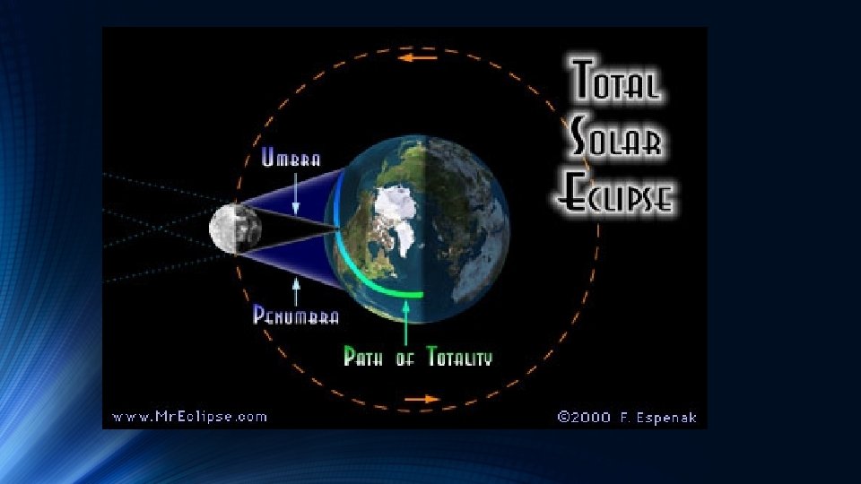 Total Solar Eclipses • If the Moon’s inner (umbral) shadow sweeps across Earth, a total eclipse can be seen • The path the inner shadow moves across Earth is called the Path of Totality • The path is only about 100 miles wide • To see a total eclipse, one must be inside the path • It’s very rare to see a total solar eclipse twice in one place • Ex: Princeton, NJ had a total solar eclipse in 1478. Next one will be 2079!