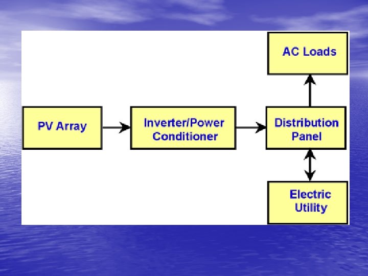 Grid-connected or Utility-Connected • Grid-connected or utility-interactive PV systems are designed to operate in • • parallel with and interconnected with the electric utility grid. These system contain an inverter, called a power conditioning unit (PCU) which converts the DC power produced by the PV array into AC power consistent with the voltage and power quality requirements of the utility grid. A bi-directional interface allows the AC power produced by the PV system to either supply personal electrical loads, or return power back to the grid when the PV system output is greater than the personal demand.