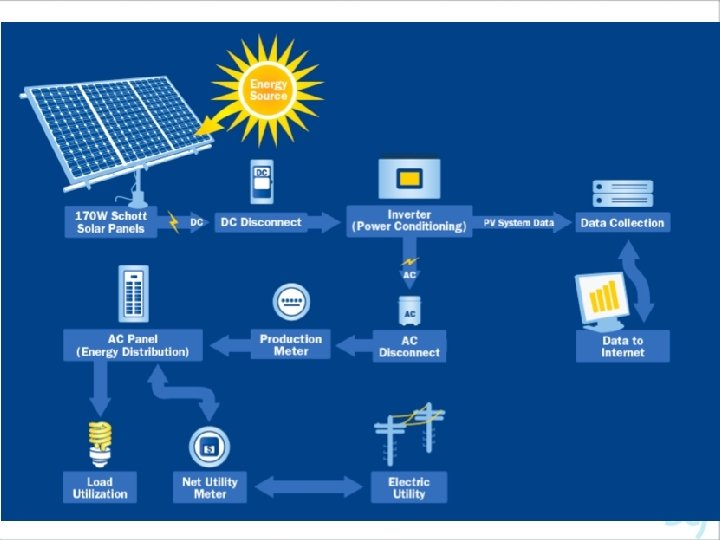 PV system components • AC Panel: Where the PV system connects to a facility’s electrical system • Net Meter: Tracks any energy that the system sends back to the grid • Electric Utility Grid: The larger electrical system that provides energy to the community