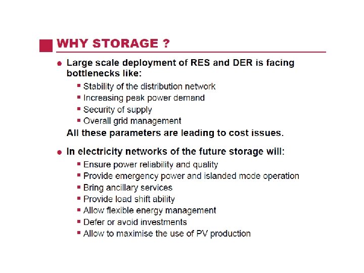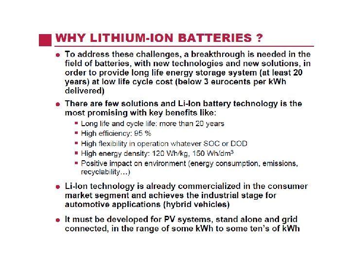 References • • “ 2008 SOLAR TECHNOLOGIES MARKET REPORT, U. S. Department of Energy”, 2010 “The Materials Science of Semiconductors”, Angus Rockett, Springer Science, New York, NY, 2008 “Advanced PV Energy Storage System with Lithium-Ion Batteries”, Saft, EUROSOLAR Conference, 31 st October 2006 “The Role of Energy Storage in the Modern Low-Carbon Grid”, Paul Denholm, National Renewable Energy Laboratory, June 12, 2008 “Adding value to the future electricity grid: The Role of Energy Storage”, Eurobat, EPIA Industry Forum, 2009 “The Role of Energy Storage with Renewable Electricity Generation”, Technical report, NREL/TP-6 A 2 -47187, January 2010 “Storage Devices in PV System: Latest Developments, Technology and Integration Problems”, John M. Hawkins, Solar Photovoltaic Energy Workshop, 1998