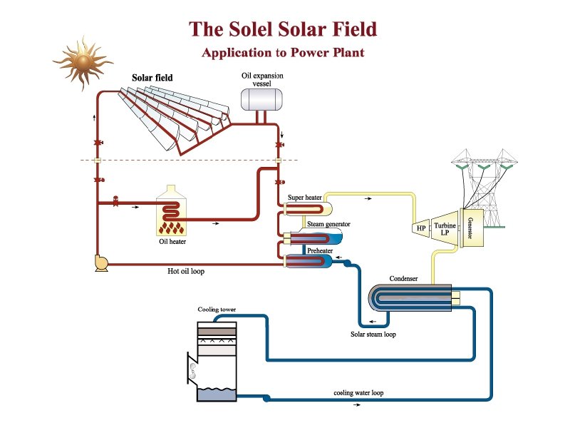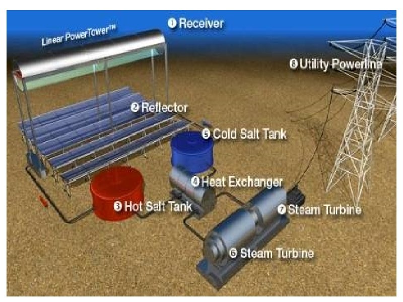 Continue • Each method of concentrating solar power convert different amount of energy. • In a solar trough, the working fluid is heated up to 150 -350 °C, then it is used as the hearing source to a power generation unit. • In the parabolic system, the working fluid is heated up to 250 -700 °C. The heat is then used by a stirling engine to generate electricity. • In the solar power tower unit, the working fluid is heated up to 500 -1000 °C. Then it is used for power generation or energy storage. • Ultimately, a solar power tower offer more energy efficiency and can store more energy than a solar trough system.