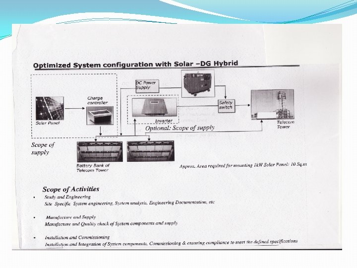 System Configuration �The Solar systems are designed to provide either DC or AC output power depending on type of load. Most telecom systems operate on 12/24/48 v DC. Typical system sizes are 2, 3, 4 & 7 kw. �The system provides sufficient energy for the specific applications and store the energy in maintenance free batteries. Depending on specific requirements, the system can be configured to store and provide Solar energy up to 7 cloudy – non sunshine days.