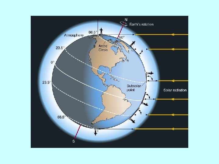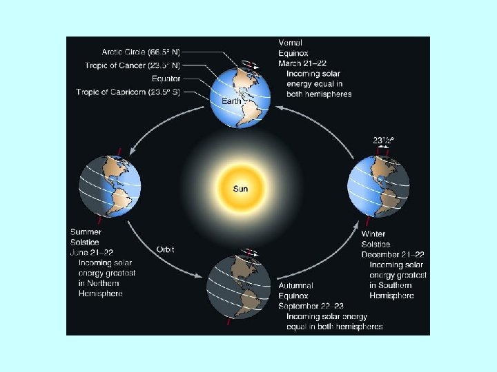 Equinox and Solstice • Summer Solstice (On or about June 21 st) – The Northern Hemisphere has its maximum tilt toward the Sun • Winter Solstice (On or about December 21 st) – The Northern Hemisphere has its minimum availability of solar radiation • Spring and Autumnal Equinox (On or about March 21 st and September 21 st) – On the equinoxes, every place on Earth has 12 hours of day and night – Both hemispheres receive equal amounts of energy.