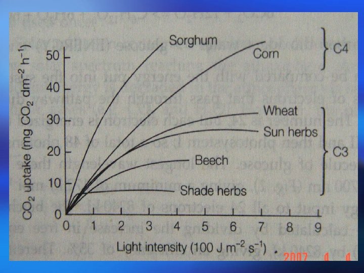 A major difference in the photosynthetic capacity of plants is that between C 3 and C 4 plants are C 3 and C 4 plants able to capture CO 2 with greater water use efficiency than C 3 plants, but this advantage comes at an energy cost. In C 4 plants the rate of photosynthesis increases with light intensity, whilst photosynthesis tails off with increasing light intensity in C 3 plants. 植物光合能力中的主要差别是在C 3和C 4植物之间。 C 3和C 4植物能捕获CO 2 ,伴随着水的利用效率比C 3植物 更大,而这优点需要消耗能量。在C 4植物中,光合作 用率随光强度而增加,而C 3植物随光强度增加光合作 用渐渐减小。