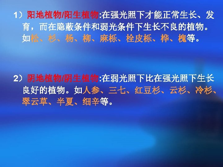 A major strategic difference between plant species in their response to the intensity of radiation is exhibited Strategic and tactical response of plants to radiation by ‘sun species’ and ‘shade species’, which possess a range of adaptations to high and low light levels, respectively, Also, plants may grow leaves which develop differently under different light conditions as part of a tactical response to the light environment. This is most clearly seen in the formation of sun leaves and shade leaves within a leaf canopy of single plant. 植物种间对辐射强度反应的主要战略差异显示为“阳地 种”和“阴地种”,它们分别具有适应于高的和低的光辐 植物对辐射的 战略和战术 响应 射范围。同样,植物能够在不同光条件下生长不同的叶 子,作为对光环境的部分战术反应。这一点最清楚地在 单株植物叶冠内的阳叶和阴叶的结构上看到。