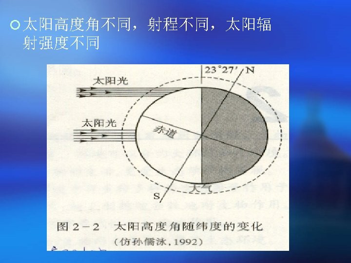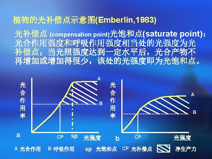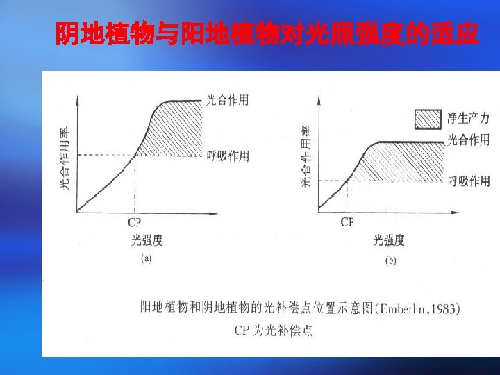 Plants rarely achieve their full photosynthetic Changes in the intensity of radiation potential, due to water shortage and to variation in the intensity of radiation. The systematic variations in light intensity are spatial and temporal of solar radiation. Less systematic variations in light intensity are caused by the positioning of leaves in relation to each other. 植物很难获得它们完全的光合作用潜能,是由于水 辐射强度的 变化 短缺和辐射强度的改变。光强度的系统变化是太阳 辐射的空间和时间的差异。光强度中极少部分的系 统变化是因叶子彼此的相对位置引起。