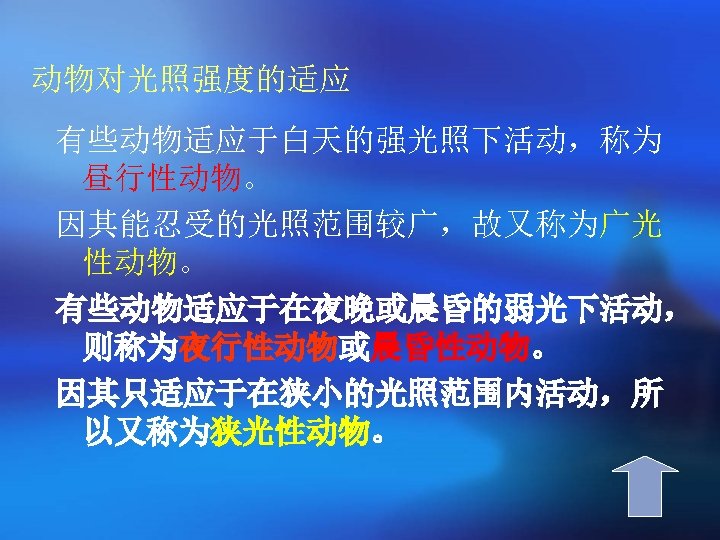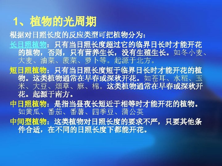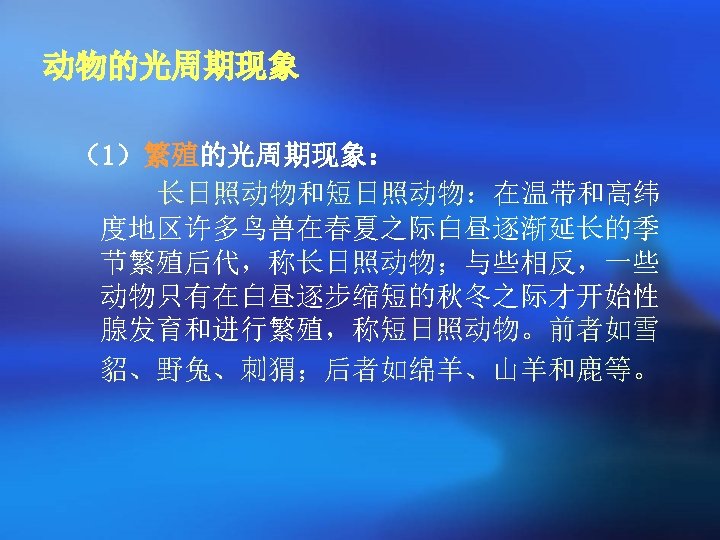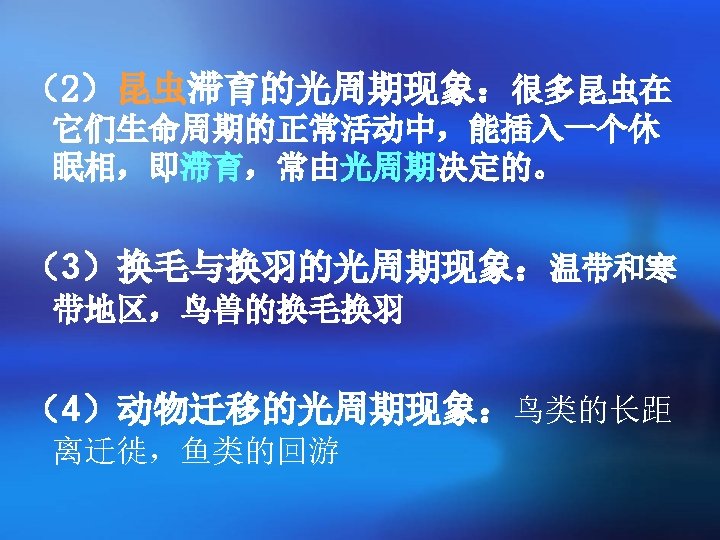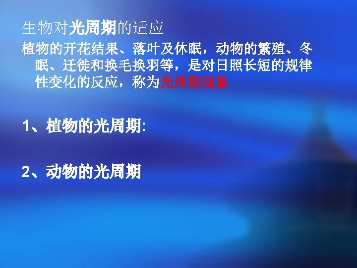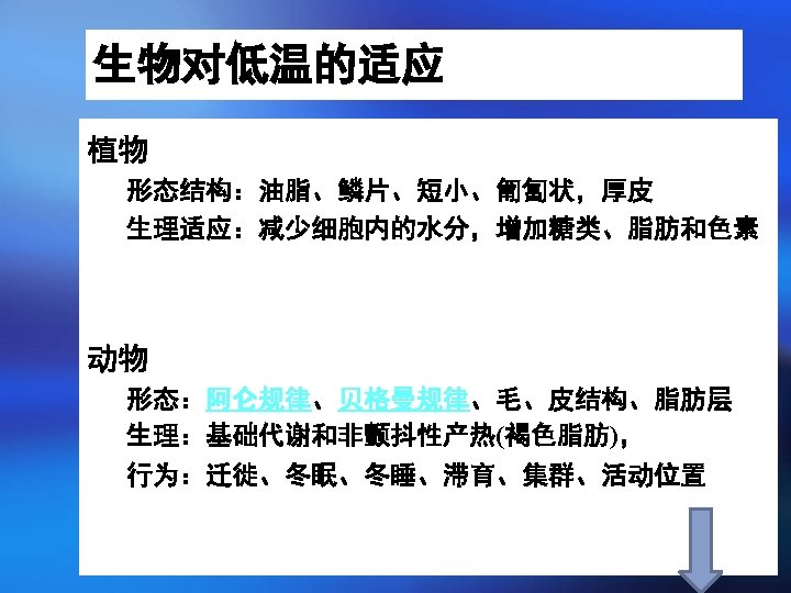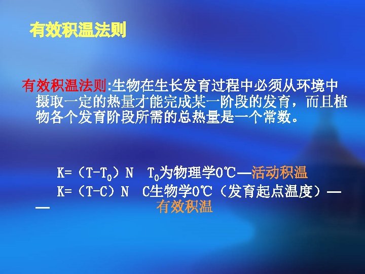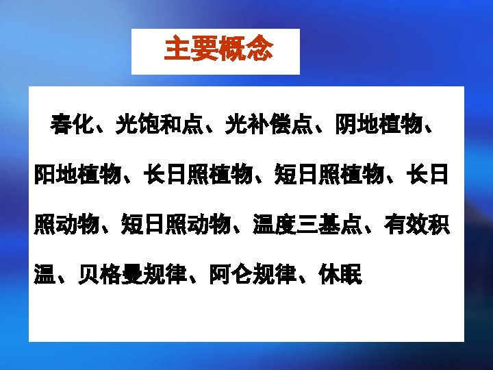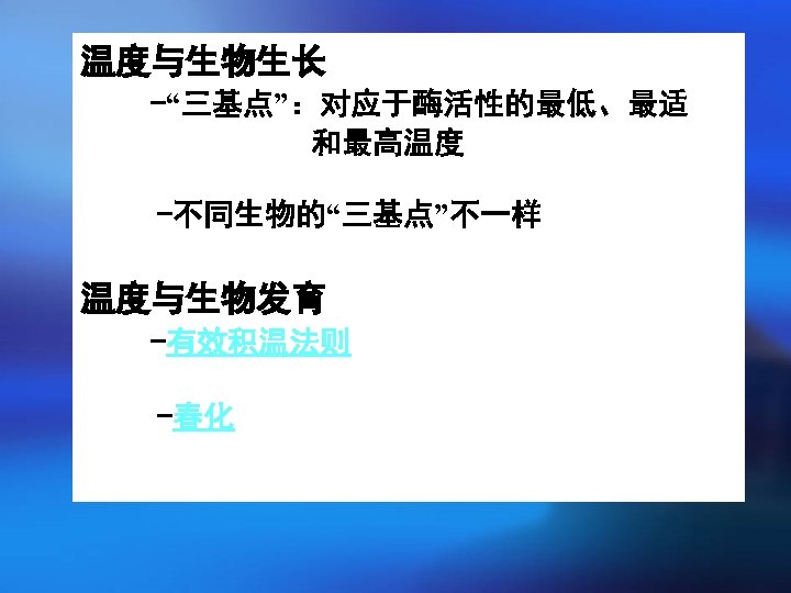 Temperature may also act as a stimulus, determining whether the organisms will begin development. Vernalization is the Vernalization and Acclimation induction of flowering by low temperatures. Exposure of an organism to higher (or lower) temperatuers in the laboratory can alter the organisms temperature response. The habituation of an organism’s response to changes in laboratory environmental conditions is termed acclimation. Acclimatization is the habituation of an organism’s physiological response to changes in natural environmental conditions. 温度能够作为一种刺激物起作用,决定有机体是否将开 始发育。春化法是通过低温诱导开花。有机体在实验室 春化和驯化 里暴露到较高(或较低)的温度能够改变有机体的温度 反应。有机体对实验环境条件变化产生的适应性反应称 为驯化(acclimation)。有机体对自然环境条件变化产 生的生理适应性反应称为气候驯化(acclimatization)。