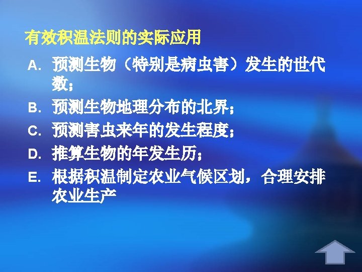 TEMPERATURE The rate of an enzyme catalyzed reaction increases with temperature. The temperature coefficient (Q 10) is an index Ecological Effects of temperature of the effect of a 10℃ temperature rise on metabolic rate, and is often near 2. 0. Within the nonlethal temperature range the most important effect on organism of temperature is likely to be its effect on growth and development. 温度的生态作用 酶催化反应的速度随温度而增加(温度系数 (Q 10) 是温度升高 10℃对代谢速度影响的指 数,经常大约为 2. 0)在非致死温度范围内, 温度对生物最大的影响很可能是影响了生长 和发育。