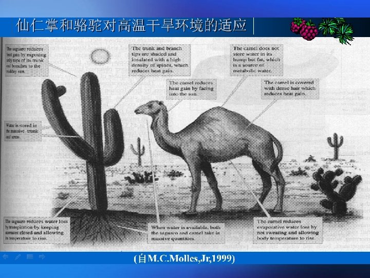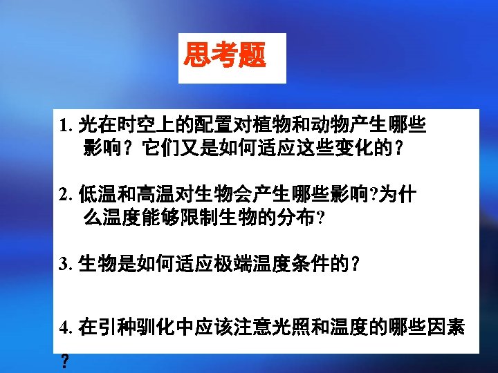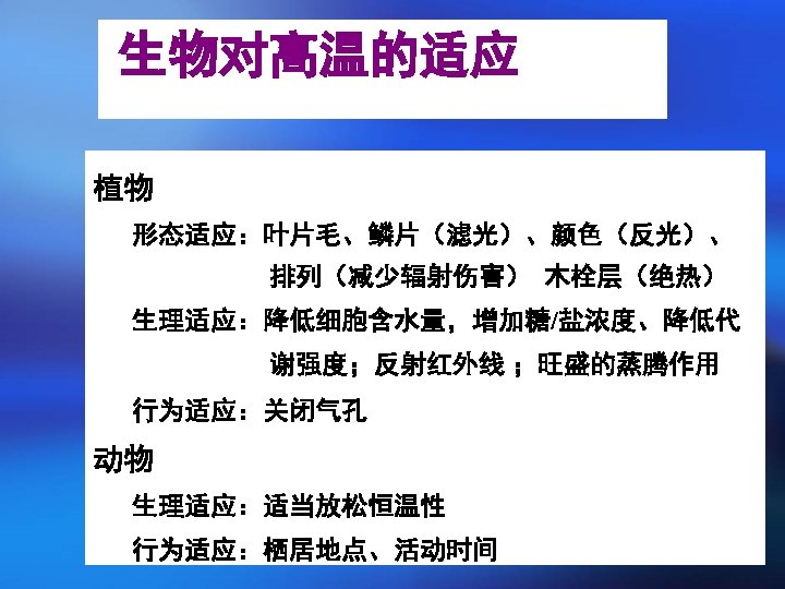 High temperatures may lead to enzyme inactivation Temperature thresholds or the unbalancing of components of metabolism; for example, in plants, respiration may proceed faster than photosynthesis, leading to death, however, the most frequent effect of high temperature on organism is dehydration. All terrestrial organism must conserve water but at high temperatures rates of water loss can be lethal. 高温可能导致酶失活或代谢组分不平衡,例如植 物的呼吸作用快于光合作用而导致死亡。然而高 温 度 阈 温对生物最普遍的影响是引起脱水。所有陆生生 物必须保持水,但在高温下失水率能够成为致死 因子。