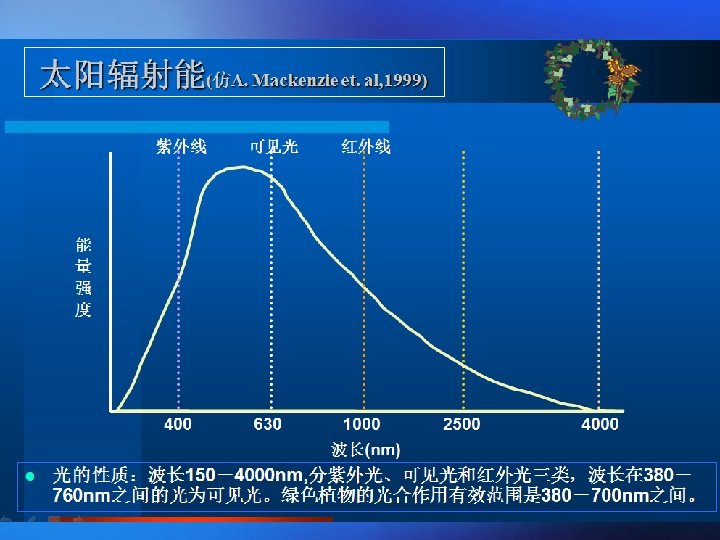 Solar radiation contains a spectrum of different wavelengths. However, only a restricted band of this spectrum is effective for photosynthesis. This is the band of photosynthetically active radiation (PAR) and for green plants lies between 380 and 710 nm. 太阳辐射包含了不同波长的光谱。然而,仅有一个有限的光 谱带对光合作用是有效的。这就是光合活性辐射(PAR)带, 对绿化植物是位于380 nm到 710 nm之间。